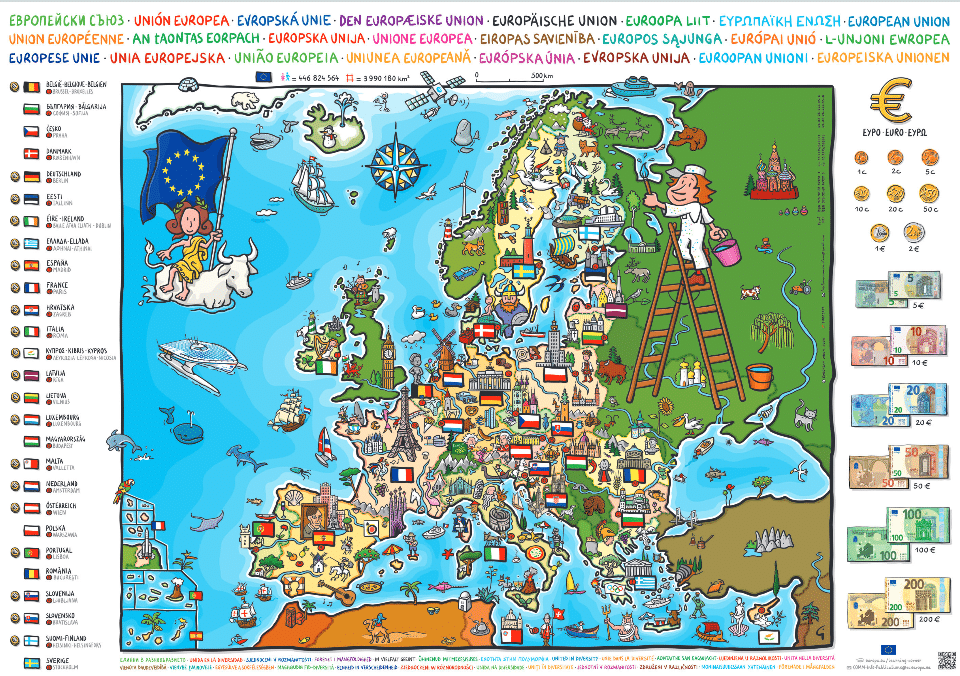 Gefaltetes Europa-Poster für Kinder mit Abbildungen der Euro-Münzen und Scheine. Bilder veranschaulichen die nationalen Besonderheiten und Traditionen des jeweiligen Landes.…