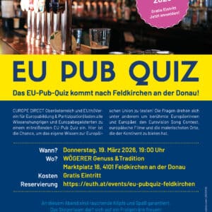 EU Pub Quiz in Feldkirchen an der Donau EUROPE DIRECT Oberösterreich und EUth (Verein für Europabildung & Partizipation) ... 19 März 19:00 - 22:00 Wögerer Genuss und TraditionMarktplatz 18, 4101 Feldkirchen an der Donau