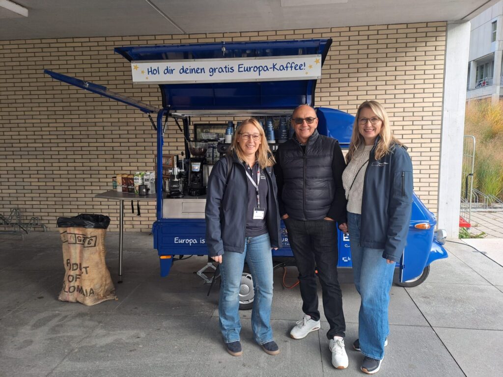Wie in den Jahren zuvor machte die beliebte Europa-Café-Ape anlässlich der ErasmusDays am 16. Oktober an der Johannes Kepler Universität in Linz halt. Bei einem frisch zubereiteten und ausgezeichneten Kaffee kamen Studierende und Professoren zusammen und unterhielten sich in entspannter Atmosphäre über die verschiedenen Möglichkeiten für Auslandsaufenthalte im Rahmen von Erasmus+ und über diverse aktuelle Themen.