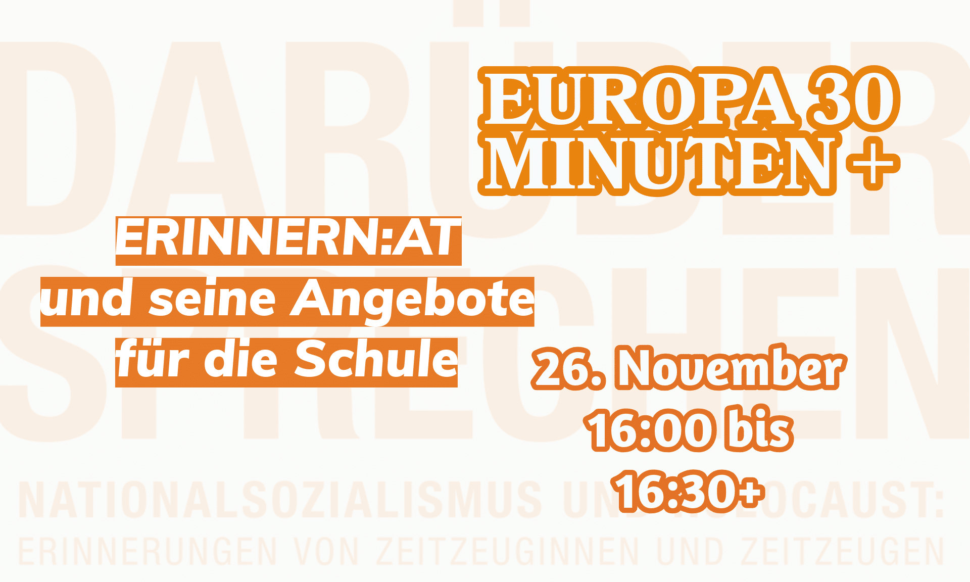 Am Mittwoch, 26. November 2025  ist von 16:00 bis 16:30+ Patrick Siegele, Leiter von ERINNERN:AT, im Online-Format “Europa 30 Minuten+” zu Gast und stellt das umfassende pädagogische Angebot für Schulen zu den Themen Holocaust, Nationalsozialismus, Antisemitismus, Rassismus vor. Weitere Informationen und Anmeldung https://www.politik-lernen.at/erinnern_at_30minutenplus