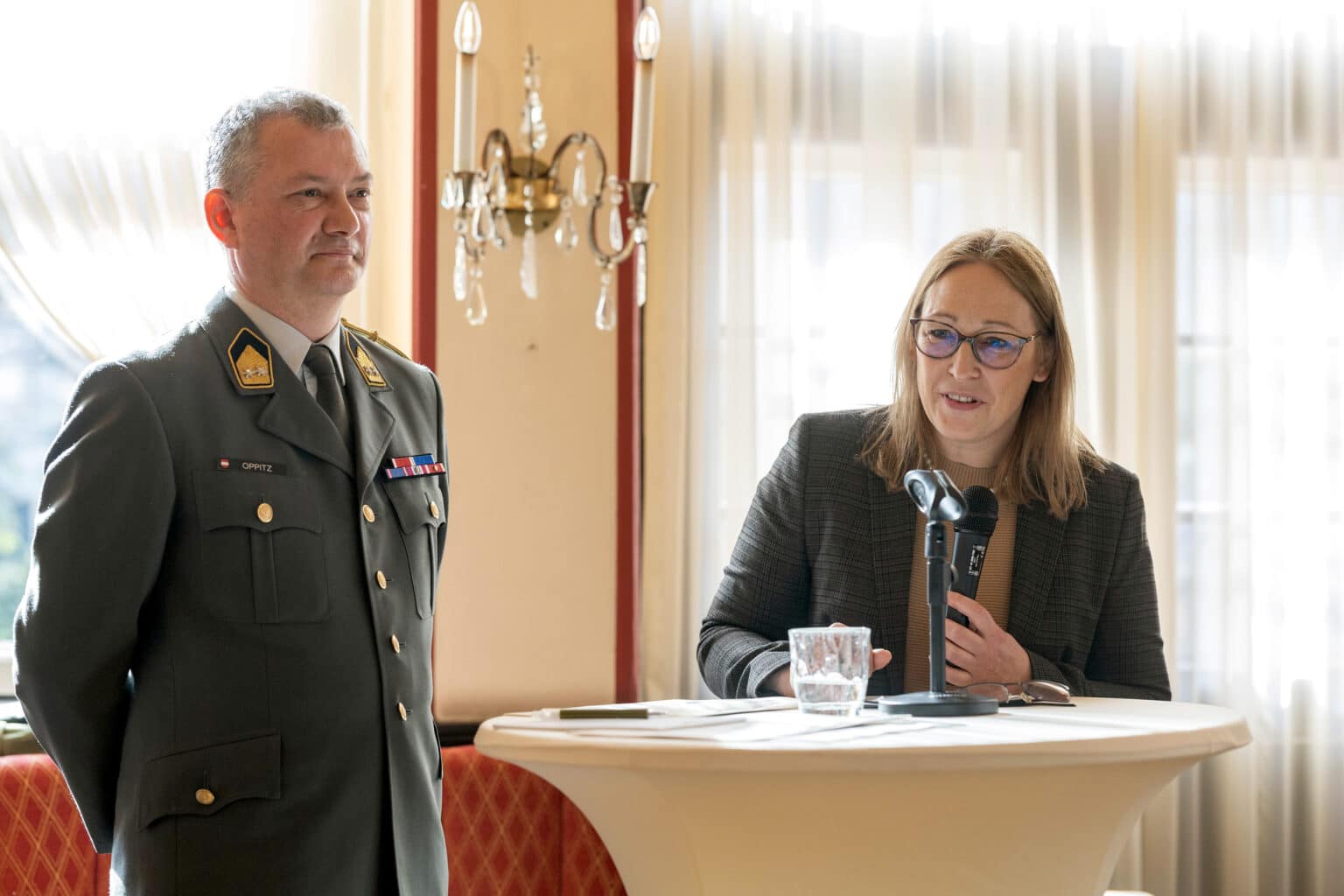 Zur Frage der Landesverteidigung betonte Oppitz, dass das Ziel für die Europäische Union und auch für jeden einzelnen Mitgliedstaat sei, das eigene Territorium verteidigen zu können. Dabei müsse man sorgsam handeln unter der Prämisse keinen Krieg zu provozieren. In Österreich stehe die Landesverteidigung auf vier Säulen, die gemeinsam zur Stabilität des Landes beitragen: