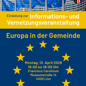 Einladung zur Informations- und Vernetzungsveranstaltung “Europa in der Gemeinde” Sind die Bürgermeisterin, Bürgermeister, Gemeinderätin oder Gemeinderat? Möchten Sie die ... 13 Apr. 16:00 - 18:00 Francisco CarolinumMuseumstraße 14, 4020 Linz