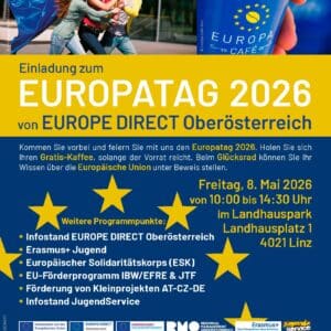 Europatag in Linz Kommen Sie vorbei und feiern Sie mit uns am Freitag, ... 08 Mai 10:00 - 14:30 Landhauspark LinzLandhausplatz 1, 4021 Linz
