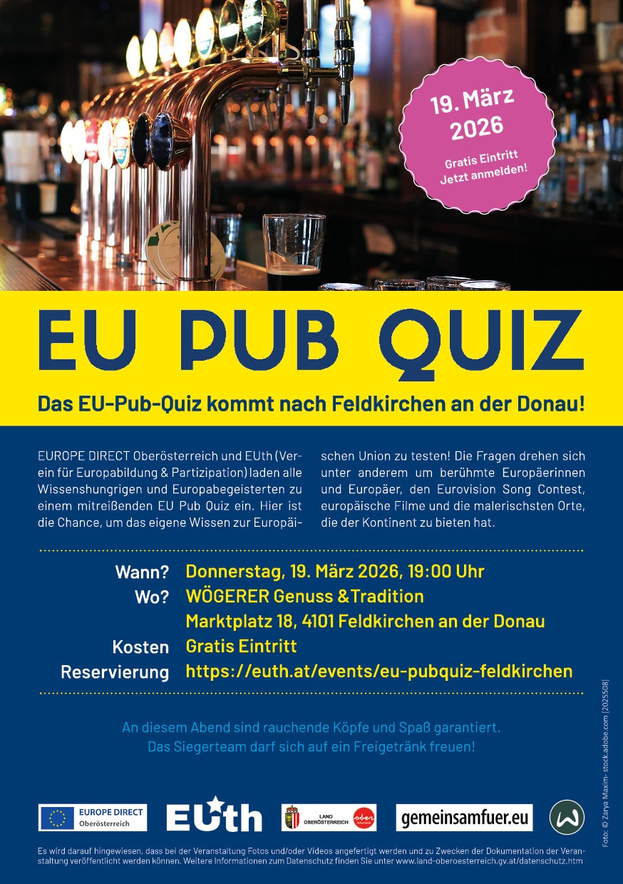 EUROPE DIRECT Oberösterreich und EUth (Verein für Europabildung & Partizipation) lädt alle Wissenshungrigen und Europabegeisterten zu einem mitreißenden EU Pub Quiz ein. Hier ist die Chance, um das eigene Wissen zur Europäischen Union zu testen! Die Fragen drehen sich unter anderem um berühmte Europäerinnen und Europäer, den Eurovision Song Contest sowie europäische Film und die malerischsten Orte, die der Kontinent zu bieten hat.