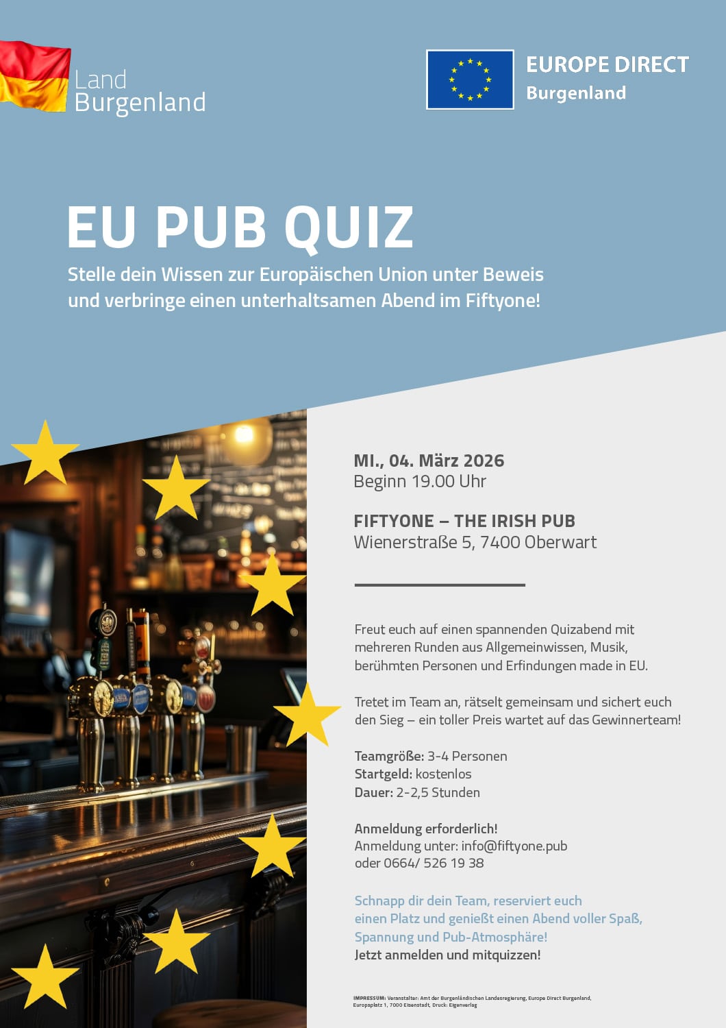 Europe Direct Burgenland lädt alle Wissbegierigen, Europa-Fans und Quizbegeisterten herzlich zum EU-Pub Quiz ein! Am 04. März 2026 heißt es mitraten, mitfiebern und mitlachen – und das in gemütlicher Pub-Atmosphäre.