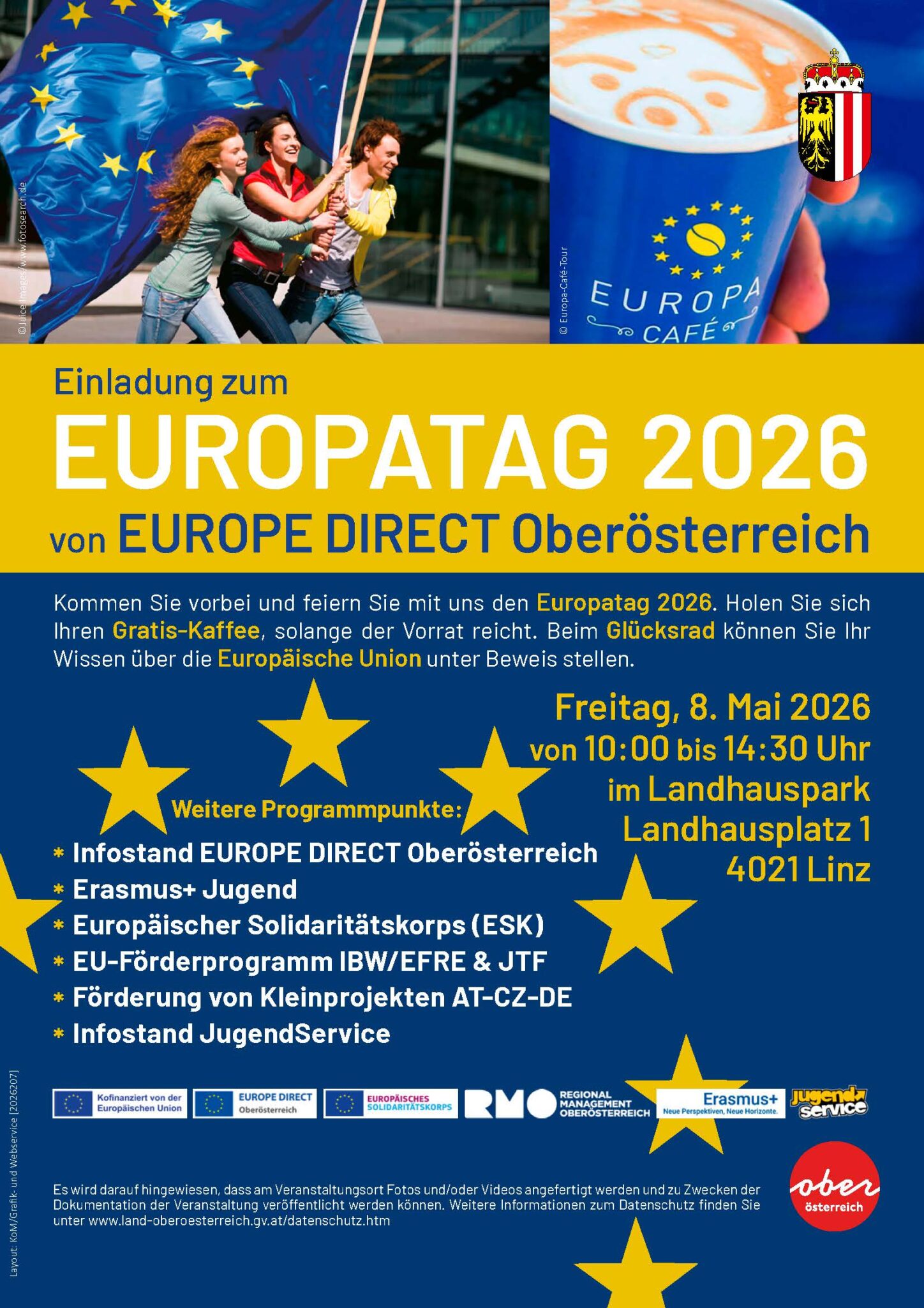 Kommen Sie vorbei und feiern Sie mit uns am Freitag, 8. Mai 2026 von 10:00 bis 14:30 Uhr den Europatag 2026 im Linzer Landhauspark.